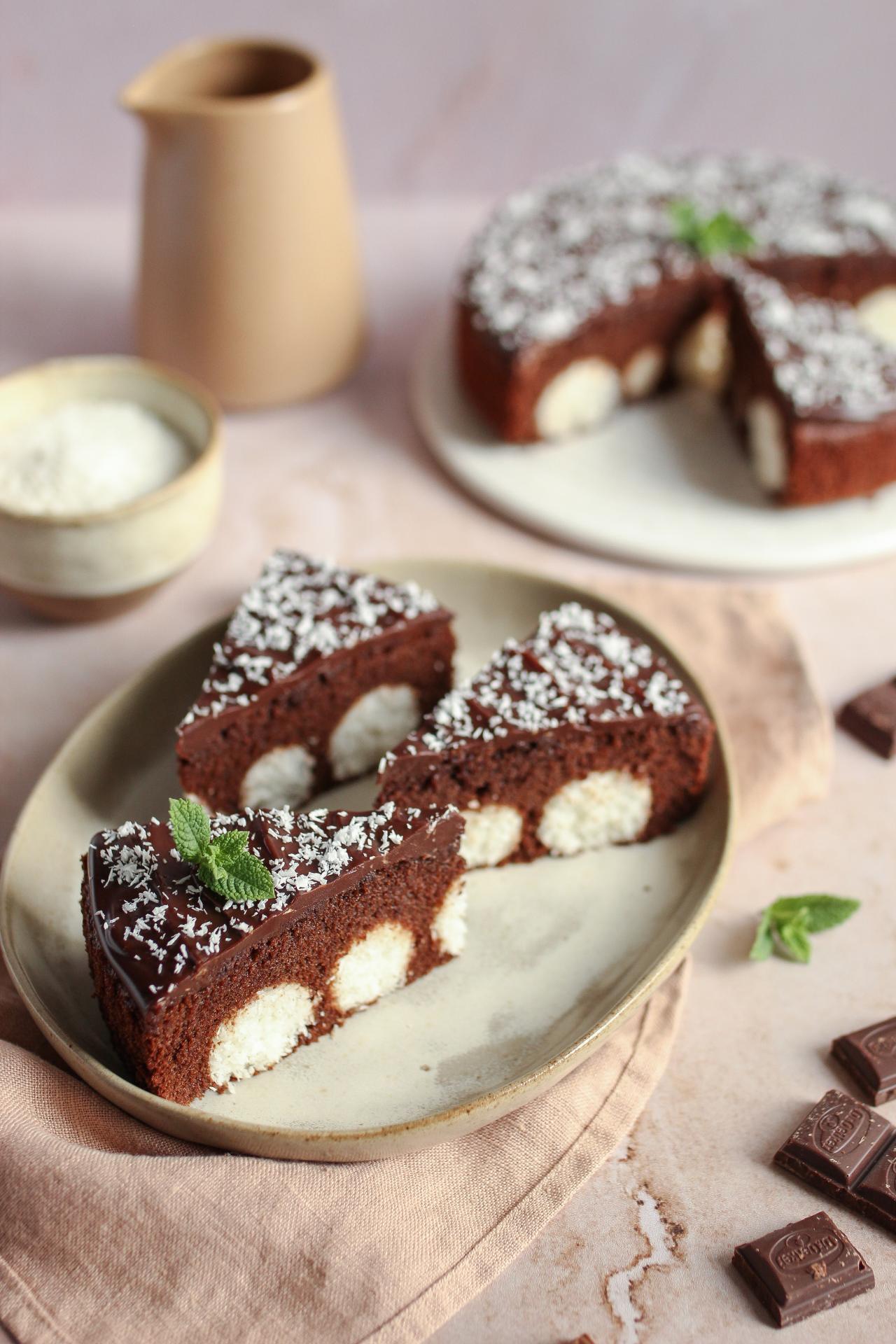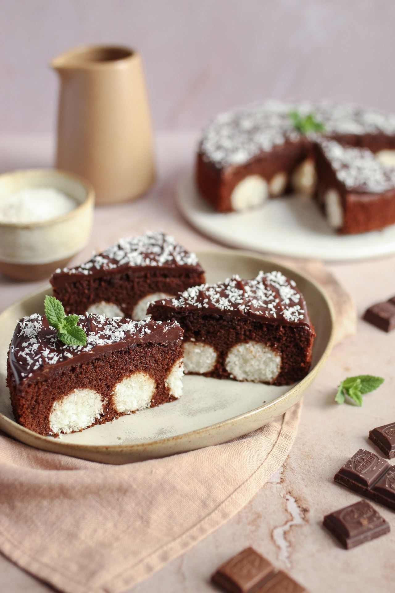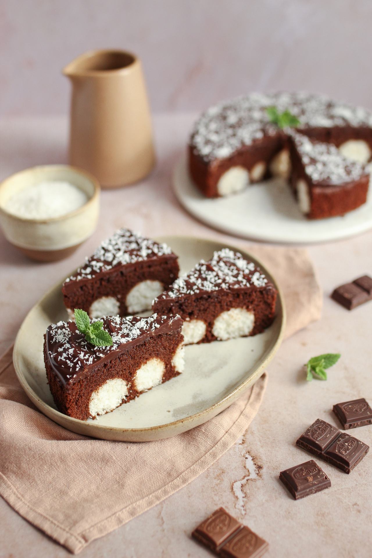 Ovaj Čokoladni kolač sa kokos kuglicama je još jedan kolač za ljubitelje famozne čoko-kokos kombinacije koja me odmah na prvu asocira na “bounty ukus” koji obožavam. Kolač je sasvim jednostavan a opet, deluje neobično i vrlo je interesantnog preseka zbog kokos kuglica u biskvitu. 🙂