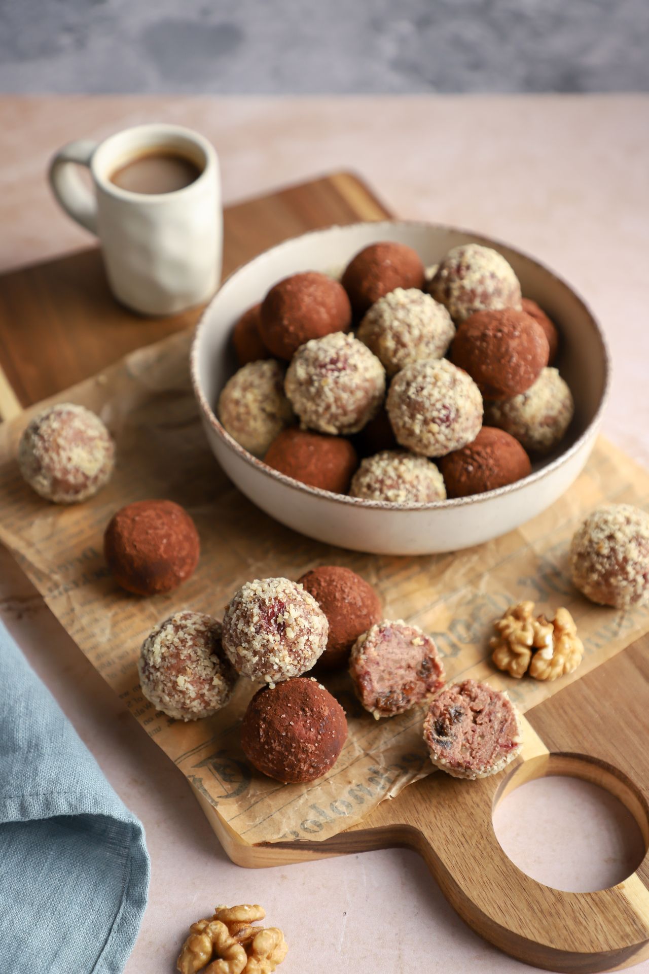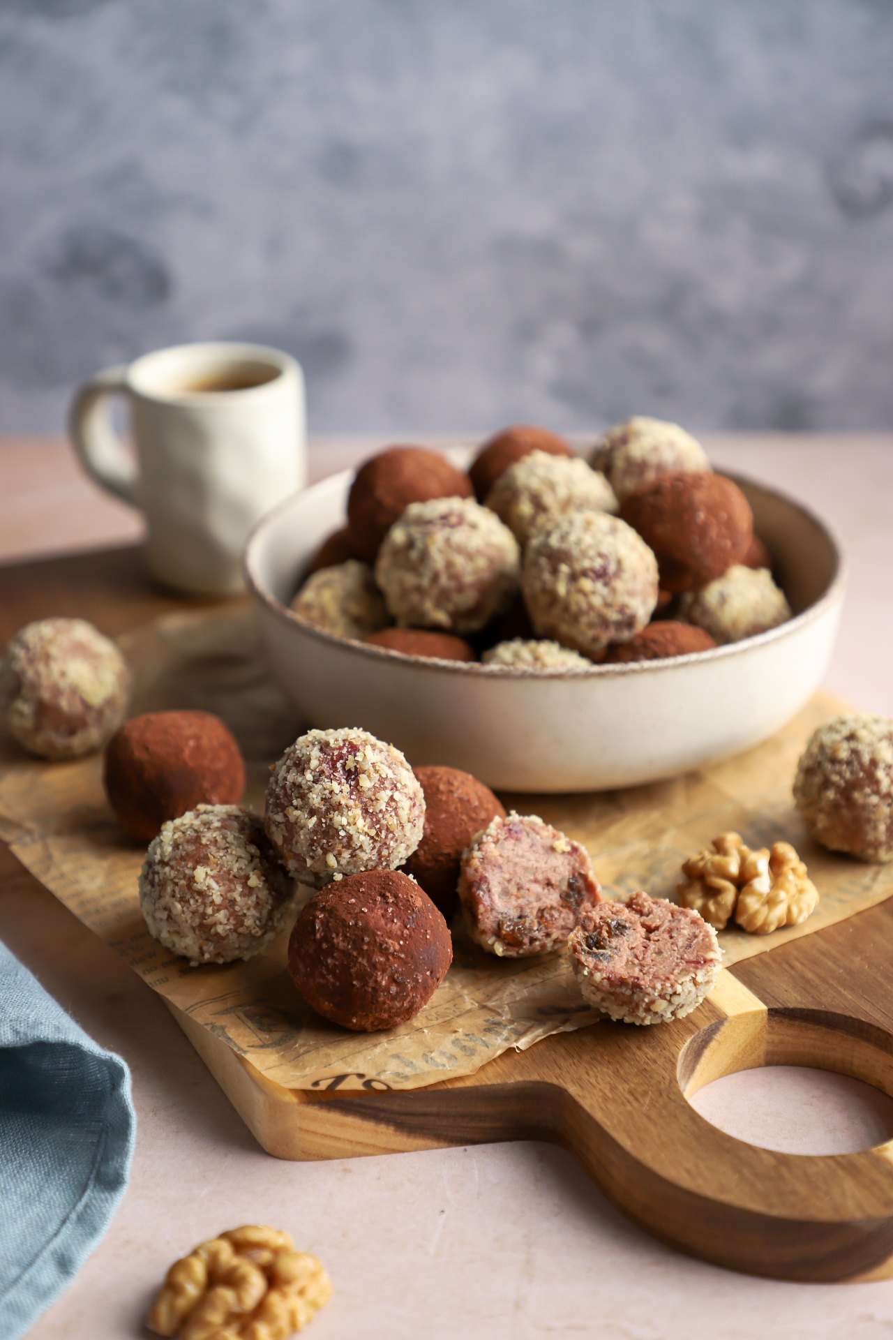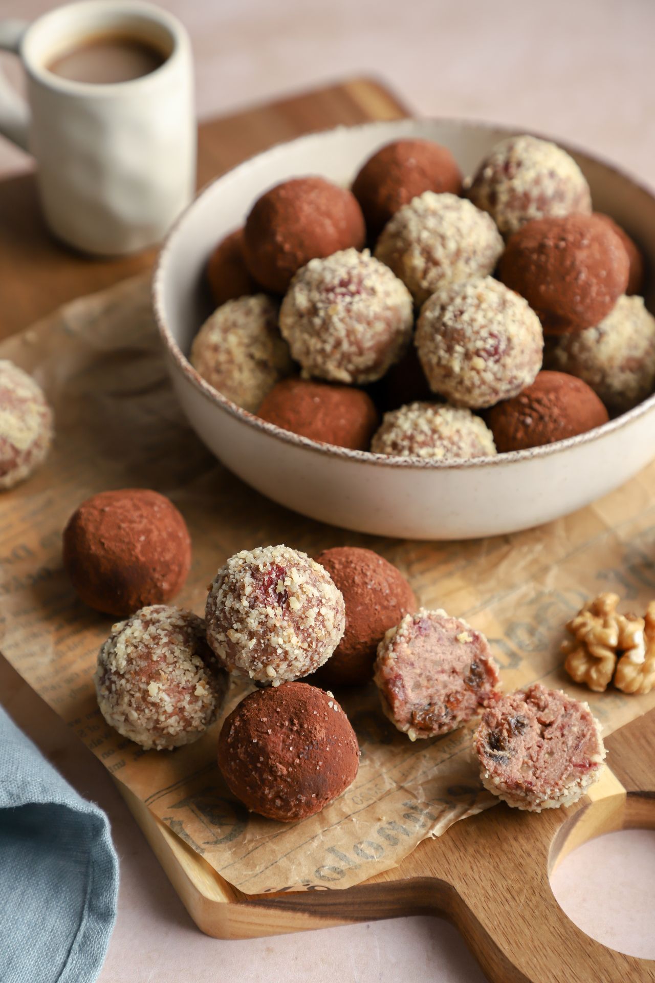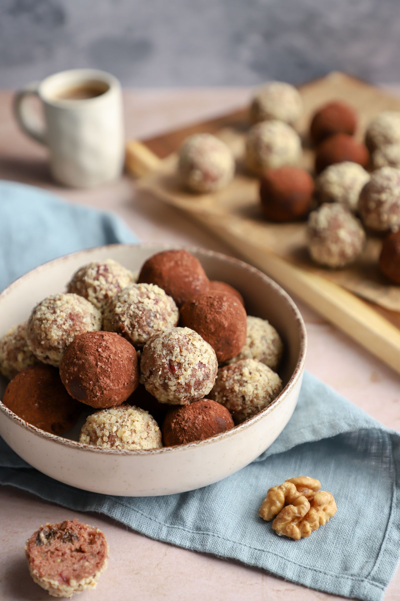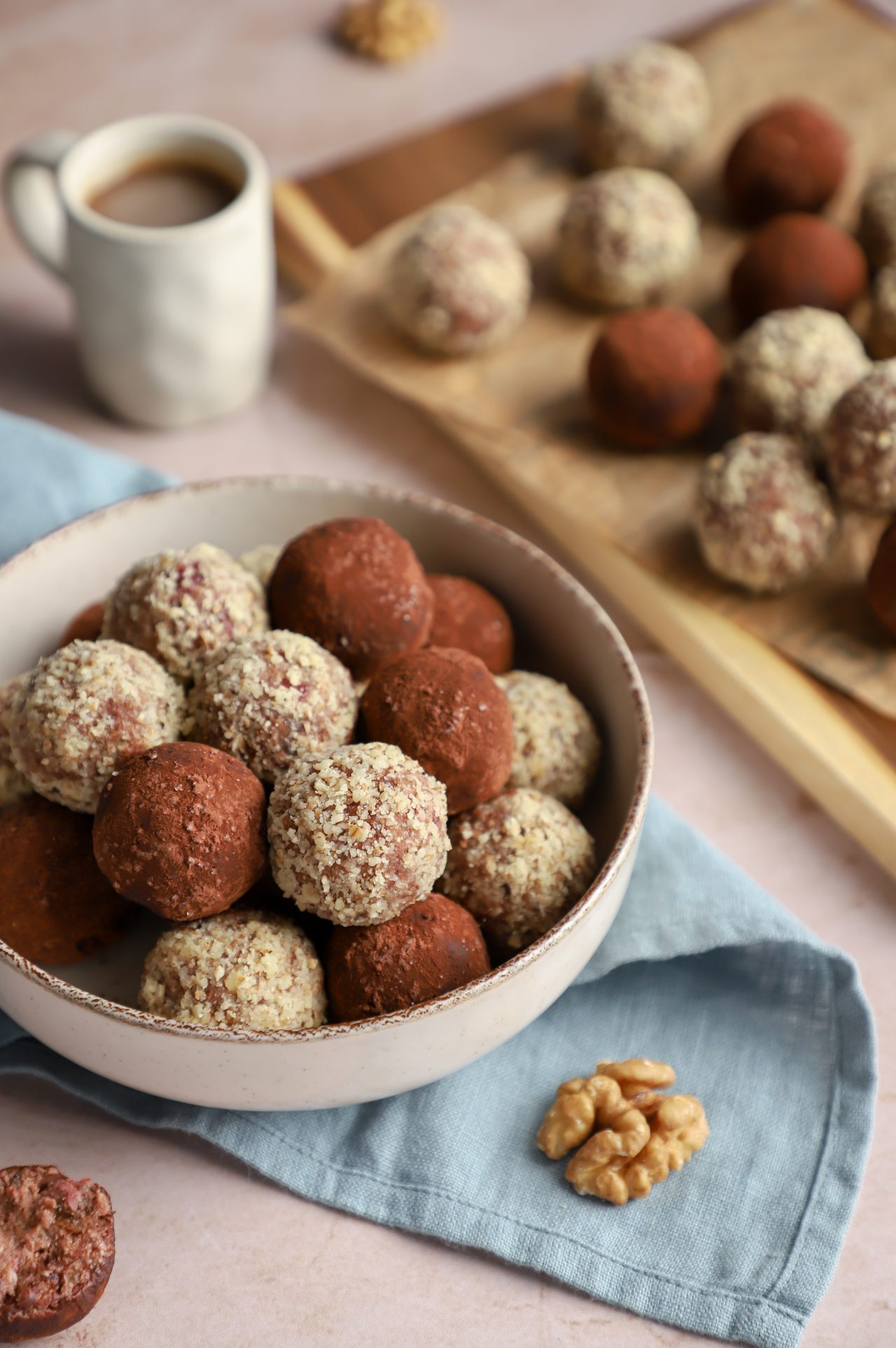 Polovinu bombica sam uvaljala u mlevene orahe a polovinu u mešavinu kakaa i malo kristal šećera. Dolazi u obzir šta god volite ili imate kod kuće, kao što je mleveni keks, kokos, čokoladne mrvice, a ako želite još elegantniju varijantu, bombice možete umakati i u čokoladnu glazuru. Šta god odabrali, nema greške. 😉