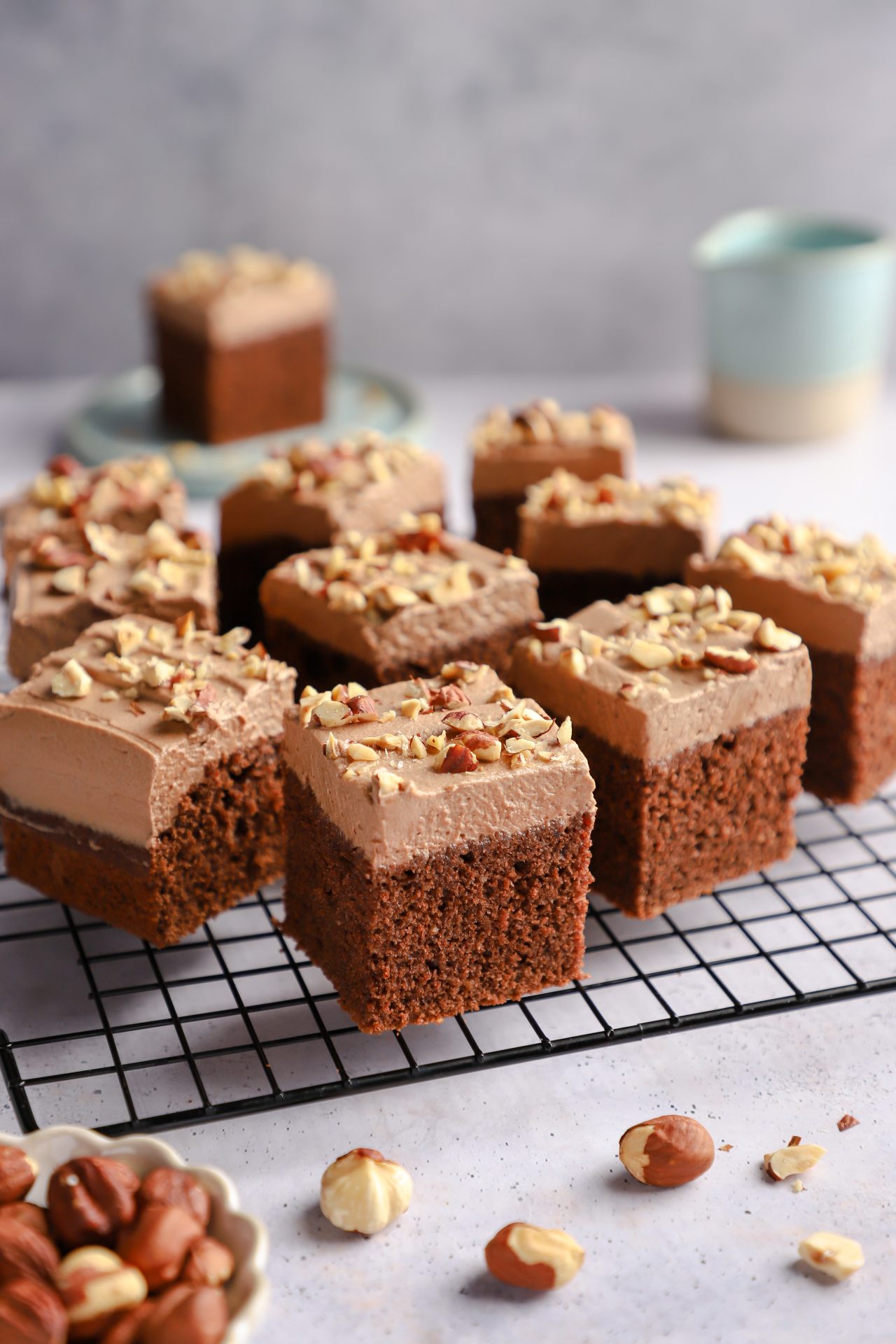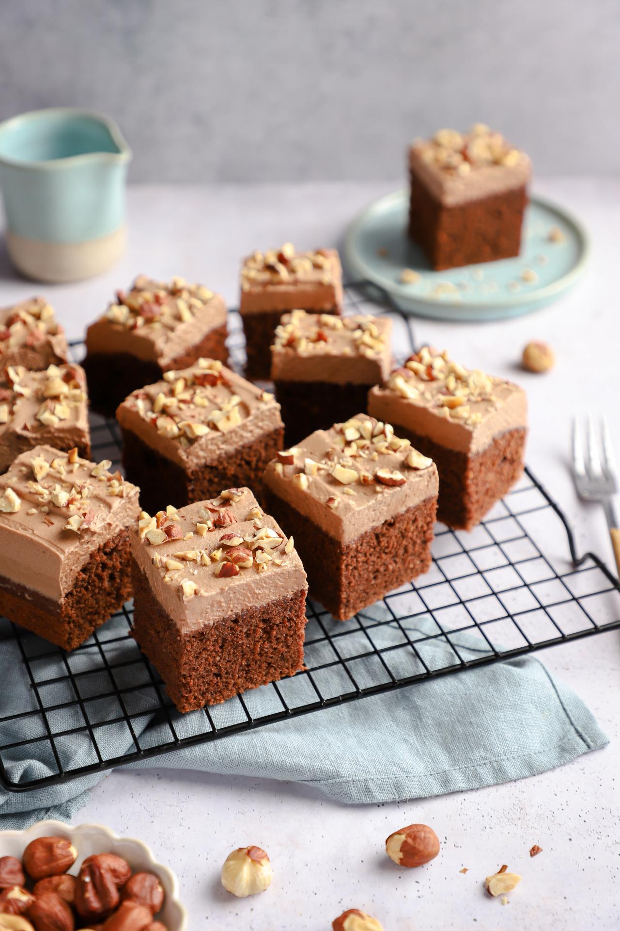 Na krem pospite seckane pečene lešnike i kolač stavite u frižider na nekih 30-60 minuta, tek toliko da se krem malo ohladi i stegne. Potom secite na kocke i poslužite.