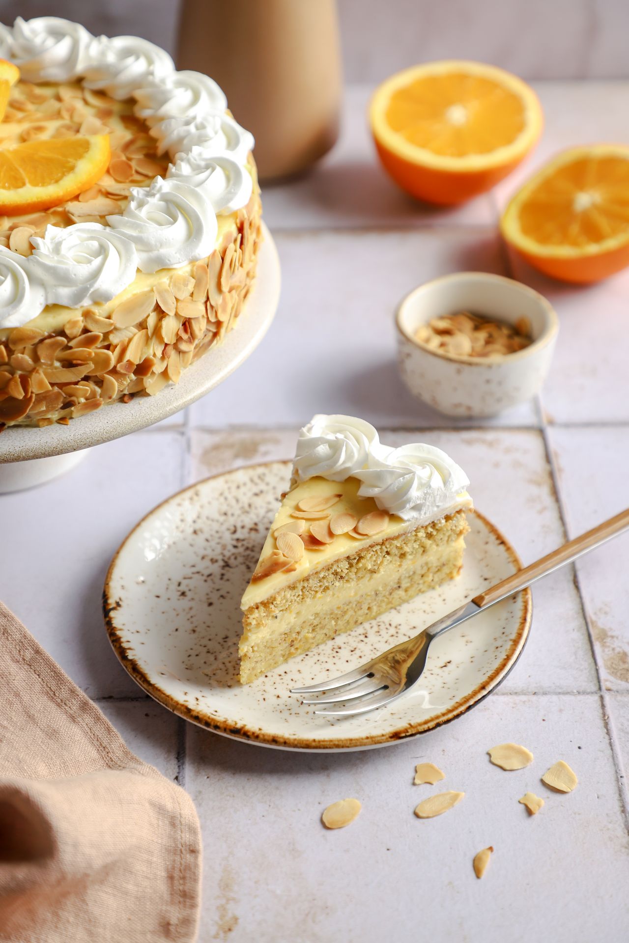 Ova mirisna i sočna Torta od narandže i badema je za sve ljubitelje klasičnih torti sa starinskim šmekom. Sastoji se od mekanog biskvita od pečenih badema i narandže i kuvanog fila na pari od celih jaja, narandže i maslaca. Neodoljivo aromatična i osvežavajuća, nikog nije ostavila ravnodušnim za mamin rođendan koji je bio povod za ovu torticu. 🙂