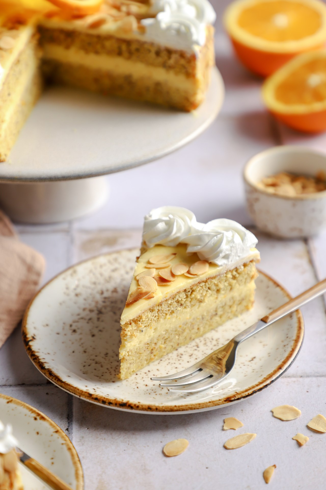 Biskvit – peče se jedan biskvit od celih jaja i pečenih mlevenih badema uz dodatak vrlo malo brašna i mlevenog keksa. Takođe se dodaje sveže ceđeni sok narandže, kao i korica, koji daju neverovatnu aromu. Pečeni biskvit se preseče horizontalno da se dobiju dve kore, tako da nema zasebnog pečenja biskvita. Biskvit će biti fin mekan i sam za sebe, ali ja sam ga dodatno natopila sa malo narandžinog soka prilikom filovanja torte, za ekstra sočnost.
